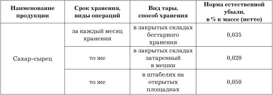 Постановлением Госснаба СССР от 26 июня 1981 г. № 59 "Об утверждении норм естественной убыли сахара-сырца, сахара-песка, сахара-рафинада и сахарной пудры при хранении на предприятиях сахарной промышленности" утверждены следующие нормы естественной убыли (см. табл. 6)