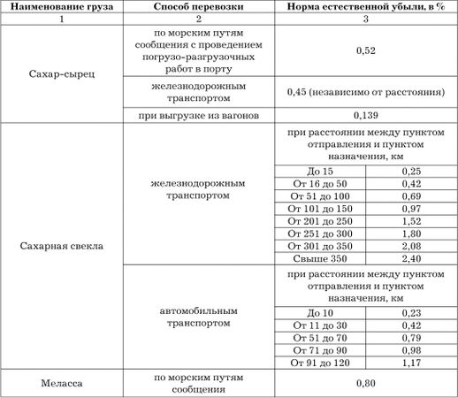 Приказом Минсельхоза РФ и Минтранса РФ от 21 ноября 2006 г. № 426/139 "Об утверждении норм естественной убыли сырья и побочной продукции сахарной промышленности при перевозке" утверждены следующие нормы естественной убыли (см. табл. 7).