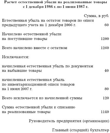Утвержденные торгующей организацией для каждого магазина, палатки, ларька и иного общие нормы естественной убыли товаров доводятся до сведения материально ответственных лиц этих предприятий не позднее чем за 15 дней до начала года. Приказ директора магазина о нормах для отделов, секций и иного доводится до сведения материально ответственных лиц этих подразделений не позднее чем за 10 дней до начала года.