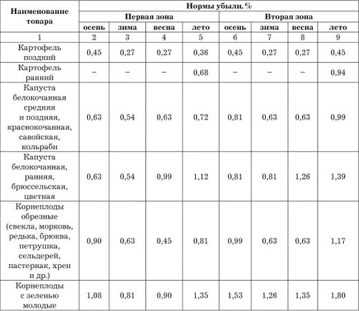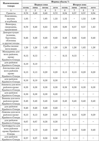 Также существуют нормы естественной убыли свежих картофеля, овощей и плодов в городской и сельской розничной торговой сети (см. табл. 9).