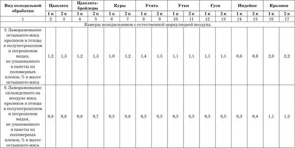 Примечание: при замораживании мяса цыплят, цыплят-бройлеров, кур, утят и уток в скороморозильных аппаратах типа ГКА применяются нормы естественной убыли на 15% и в аппаратах типа Я10-ФТМ – на 10% ниже по сравнению с нормами естественной убыли, предусмотренными для камер холодильников с принудительной циркуляцией воздуха.