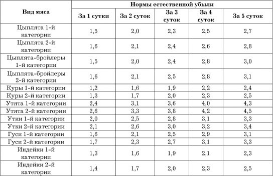 Примечание: нормы естественной убыли мяса птицы в потрошеном виде, охлажденного в ледяной воде и упакованного в пакеты из полимерных пленок, при хранении в камерах холодильников (% к массе охлажденного мяса) составляют: за 1 сутки – 0,1; за 2 суток – 0,1; за 3 суток – 0,2; за 4 суток – 0,2; за 5 суток – 0,2.