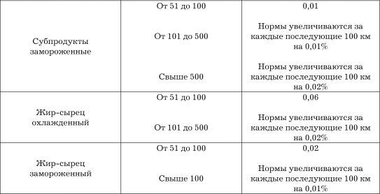 Примечание: в расчетах по определению норм естественной убыли в зависимости от расстояния при перевозках в авторефрижераторах следует принимать, что последующие 100 км начинаются с каждого 51-го км (например, при расстоянии 151 км и далее до 250 км нормы такие же, как и для 200 км).