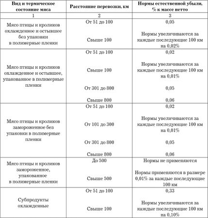 Примечание: при транспортировке птицы, упакованной в полимерную пленку, колбас сырокопченых, мясокопченостей сырокопченых и жиров топленых нормы естественной убыли не применяются.