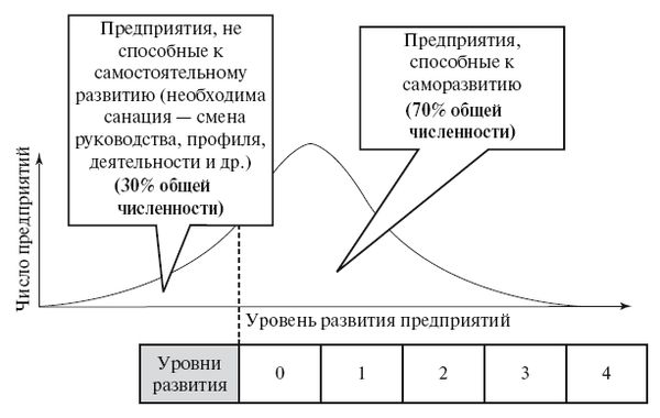 Анализ уровня развития российских компаний автор проводит с конца 1997 г., т. е. уже почти 11 лет. Результаты анализа показывают, что использование устаревших организационно-управленческих технологий приводит к тому, что в 2004 г. около 50 % предприятий, по имеющимся статистическим данным, не обладали возможностью развития и нуждались в санации. Сейчас таких предприятий менее 30 % (рис. 2.8). Более 70 % оставшихся предприятий сильно различаются по своему уровню развития.