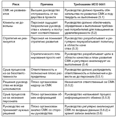 Стандарт ИСО 9001:2000 ориентирован на управление операционными рисками путем их предотвращения. В контексте стандарта пять групп процессов, следовательно, пять групп операционных рисков и в соответствии с этим – пять групп требований к процессам, предотвращающие возникновение следующих операционных рисков: