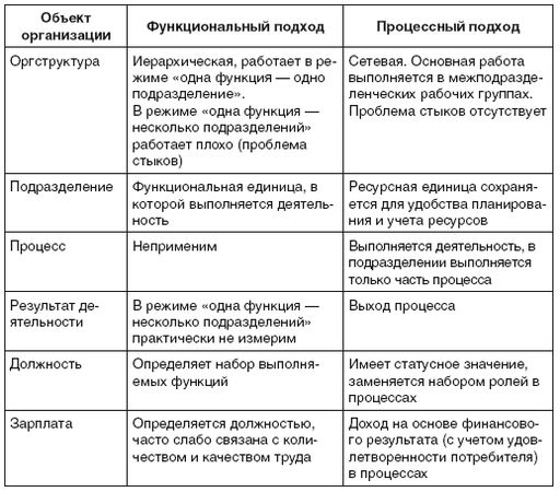 Смысл перехода к процессному подходу – сокращение численности управленцев и снижение накладных расходов (особенно в крупных организациях) по сравнению с функциональным подходом, который со времен Г. Форда и У.Ф. Тейлора применяется в организациях как основа для построения системы управления. Различия в подходах проиллюстрированы в табл. 3.1.