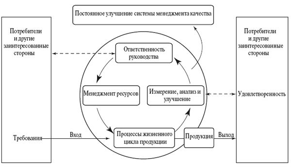 Системный подход к менеджменту качества побуждает организации анализировать требования потребителей, определять процессы, способствующие получению приемлемой для потребителей продукции, и управлять этими процессами. Система менеджмента качества может быть основой постоянного улучшения для того, чтобы увеличить вероятность повышения удовлетворенности как потребителей, так и других заинтересованных сторон. Она дает уверенность самой организации в ее способности поставлять продукцию, полностью соответствующую требованиям.