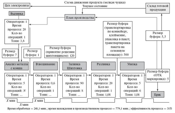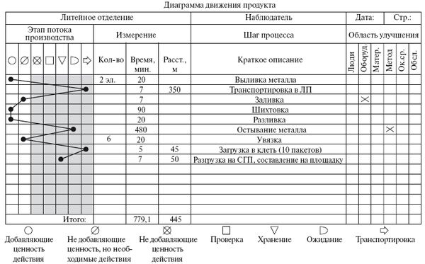 Карта текущего состояния – самый эффективный инструмент для анализа работы любых предприятий, включая компании, занятые в сфере услуг, банковской деятельности, здравоохранении, не говоря уже о производственных организациях. Она позволяет увидеть основные источники потерь и разработать план по их ликвидации или значительному снижению. На рис. 4.1 показана карта текущего состояния на примере движения продукта литейного производства.