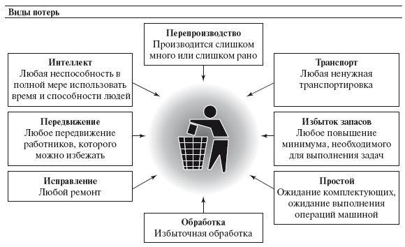 Основная идея заключается в следующем: если какое-то действие, операция или процесс не добавляет ценности продукту с точки зрения клиента, то это действие, операция или процесс рассматриваются как потери, т. е. приносящие убытки компании. Причем все потери делят на два вида.