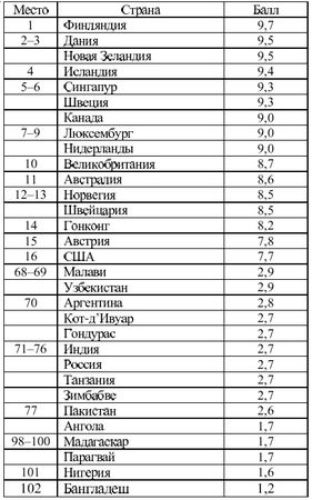 Международная неправительственная организация "Тrаnsраrеnсу International" опубликовала ежегодный доклад, посвященный ситуации с коррупцией в более чем сотне стран мира. В 2002 г. индекс восприятия коррупции (ИВК) был проставлен 102 странам мира – от Финляндии до Бангладеша. Индекс отражает восприятие коррупции предпринимателями и аналитиками каждой страны и оценивает его от 10 (коррупция практически отсутствует) до 0 (очень высокий). В зависимости от уровня ИВК проставлен и рейтинг коррумпированности стран (табл. 3.1).