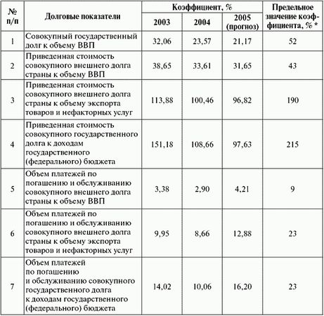 * Значения определены на уровне 85%-х величин от общепринятых в мировой практике "критических" значений долговых коэффициентов.