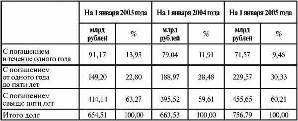 В течение 2003–2004 годов удалось существенно сократить объем неурегулированных категорий внешней задолженности России. В результате проведения двух этапов обмена задолженности перед Межрегиональным инвестиционным банком (МИБ) и Международным банком экономического сотрудничества (МБЭС), а также достижения договоренностей о реструктуризации долга перед Венгрией, Оманом, Южной Кореей и Таиландом неурегулированный остаток долга бывшего СССР сократился с 6,2 млрд долл. США на начало 2003 года до 4,1 млрд долл. США на март 2005 года. Кроме того, в результате предпринятых в прошедший период мер, направленных на скорейшее достижение взаимоприемлемых договоренностей со странами-кредиторами, созданы реальные предпосылки для урегулирования уже в 2005 году задолженности бывшего СССР перед Китаем, Объединенными Арабскими Эмиратами, государствами бывшей СФРЮ и Кувейтом, а также для проведения второго транша обмена коммерческой задолженности бывшего СССР. Последнее позволит нормализовать отношения с несколькими сотнями фирм-кредиторов.