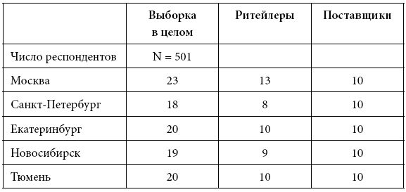 Отбор регионов. Обследование прошло в пяти российских городах: Москва, Санкт-Петербург, Екатеринбург, Новосибирск и Тюмень [21]. В Москве были опрошены 115 респондентов, в Екатеринбурге и Тюмени - по 100, в Санкт-Петербурге - 88, в Новосибирске- 98 (подробнее см. табл. 2.1). Во всех обследованных регионах активно развивается розничная торговля в её современных сетевых форматах. И по данным компании McKinsey, во всех этих городах примерно сходный уровень обеспеченности населения современными торговыми площадями (0,1–0,2 м2 на одного жителя). Но есть и существенные различия. В Москве представлено больше всего розничных сетей и поставщиков, здесь концентрируется весомая часть торгового оборота (не менее 20 % его общероссийского объёма). Санкт-Петербургу свойствен самый высокий уровень концентрации современных торговых форматов (супермаркетов, гипермаркетов и др.), заметно превышающий даже уровень Москвы, не говоря уже о других городах. Оба городских анклава в 1990-е гг. стали привлекательными объектами для развития оптовой торговли, а в 2000-е - для интенсивной экспансии со стороны федеральных и глобальных розничных сетей. Екатеринбург и Новосибирск первоначально осваивались местными сетевыми структурами, которые успели там укрепиться и сейчас конкурируют с федеральными и глобальными операторами (например, розничные сети "Купец" и "Кировский" в Екатеринбурге и "Холидей-Классик" в Новосибирске). При этом Екатеринбург известен как более закрытый город, где муниципальные власти (в противовес региональным) сопротивлялись приходу "чужаков". Хотя развитие сетевого ритейла в Тюмени пока и отстаёт от вышеупомянутых городов, оно имеет хорошие перспективы, поскольку город является центром экономически обеспеченного региона.