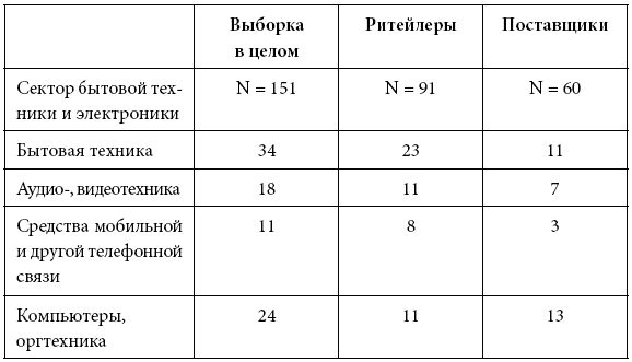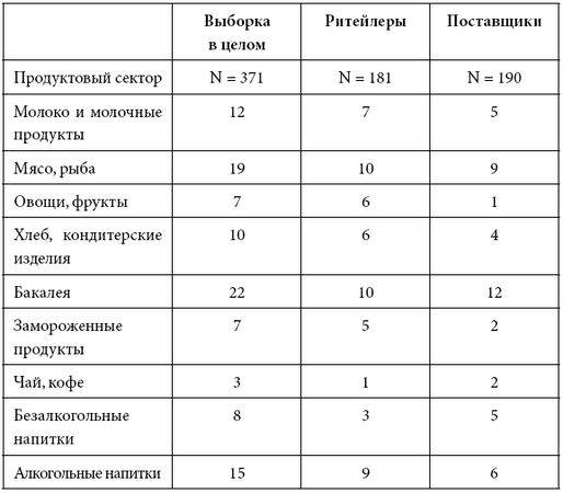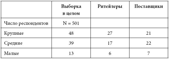 В результате в нашей выборке представлены компании разных размеров. В целом они делятся примерно пополам между категорией крупных и категорией средних и малых компаний (см. табл. 2.3). 48 % опрошенных составляют представители крупных игроков (включая 27 % менеджеров розничных сетей и 21 % поставщиков), 39 % представляют компании среднего размера (17 % ритейлеров и 22 % поставщиков), а 13 % представляют малые компании (6 % ритейлеров и 7 % поставщиков). Среди поставщиков несколько больше представлен средний бизнес: средние компании составляют 45 %, крупные - 41 %, а малые - 14 %.