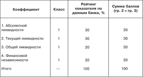 Рейтинг, или значимость, показателя в системе устанавливается специалистами банка для каждого заемщика в отдельности исходя из кредитной политики и ликвидности его баланса. Например, высокая доля кредитных ресурсов в пассиве баланса, наличие просроченной задолженности по ссудам банка повышает роль коэффициентов ликвидности. Отвлечение ресурсов банка в кредитование постоянных материальных запасов, низкое значение величины чистого оборотного капитала, т. е. менее 10 % общего объема оборотных активов, повышает рейтинг коэффициента финансовой независимости. Перекредитование клиента выдвигает на первый план уровень коэффициента общей ликвидности (покрытия).