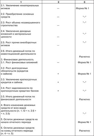 Для изучения потока денежных средств косвенным методом необходимо подготовить отдельный аналитический отчет. Исходными данными для его разработки являются: бухгалтерский баланс (форма № 1); Отчет о прибылях и убытках (форма № 2); Приложение к балансу (форма № 5); Главная книга; журналы-ордера; справки бухгалтерии и др. Алгоритм расчета движения денежных потоков косвенным методом представлен в табл. 5.3.