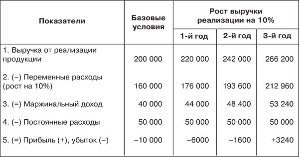 В случае снижения выручки от реализации продукции (за счет уменьшения объема производства) сила воздействия производственного рычага характеризует возможную потерю прибыли (или увеличение убытка). В особо трудное положение попадает то предприятие, у которого в условиях спада производства убытки превышают маржинальный доход, то есть эффект производственного рычага по модулю ниже единицы. Увеличение выручки от реализации продукции на таком предприятии влечет за собой снижение убытков в меньшей степени, чем рост объема производства, вызвавший его. Наоборот, предприятие, имеющее убытки ниже маржинального дохода, быстрее выйдет из кризисного состояния, так как аналогичный рост объема реализации продукции вызовет более интенсивное снижение убытков. Покажем эту зависимость на следующем примере (табл. 7.7).