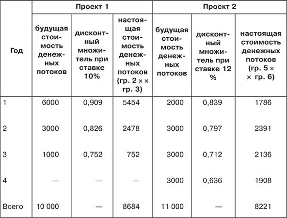 Таблица 8.2. Расчет настоящей стоимости денежных потоков по двум инвестиционным проектам, тыс. руб.