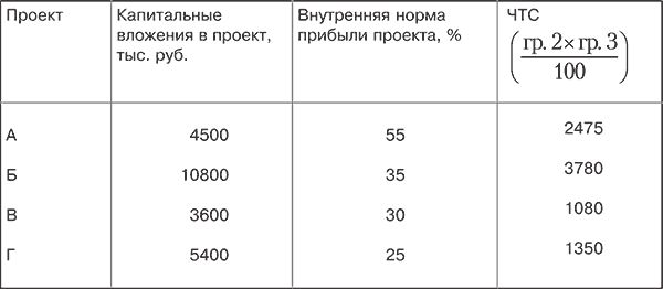 Так, для делимых проектов А, Б, В и Г при капитальном бюджете 12,600 тыс. руб. (максимизирующем ЧТС проектов), портфель инвестиций будет состоять из полной реализации проекта А (4,500 тыс. руб.) и частичной реализации проекта Б 8,100 тыс. руб. (12 600 – 4500).