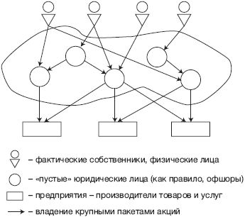 Типичную для 1990-х гг. формальную структуру собственности в компании и интегрированной бизнес-группе схематически можно описать следующим образом. Существует некоторое количество предприятий из различных отраслей и секторов экономики - промышленности, связи, торговли, финансов и т. д., имеющих форму акционерных обществ. У каждого предприятия существует свой набор акционеров. В большинстве случаев это "пустые" юридические лица, специально созданные для того, чтобы "повесить" на их баланс соответствующие пакеты акций. Они могут быть и резидентами, но чаще всего это нерезиденты-офшоры. Эти акционеры "первого уровня" также являются акционерными обществами и имеют таких же акционеров, как и они сами, и т. д. И только на концах возникающих цепочек появляются фактические собственники - российские или зарубежные. Зарубежные с равным основанием могут оказаться как физическими, так и юридическими лицами, а российские - это, как правило, физические.
