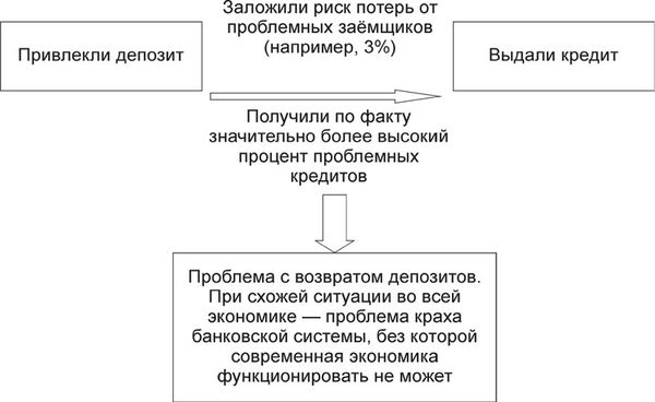 Банк как структура действительно крайне чувствителен к экономическим потрясениям, его успешность является своего рода производной от успешности реального сектора экономики. Дело в том, что банк при установлении процентной ставки по кредитам закладывает прогноз проблемных и сомнительных долгов. В случае катаклизмов в реальной экономике этот уровень фактических потерь может оказаться разительно выше планового – многие компании потерпят банкротство. В этом случае заложенный в ставку по кредитам процент проблемных долгов окажется заниженным, значит, средств, полученных банками, будет недостаточно для расчётов с вкладчиками. В свою очередь, банкротство банков быстро распространяет кризис, ведь от него страдает огромное количество граждан и предприятий. Поэтому банковский крах порождает большое количество проблем в экономике.