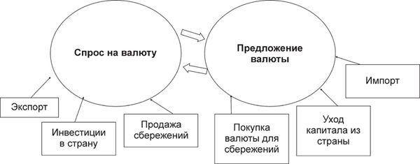 Экспорт и импорт – самые крупные потоки в платёжном балансе страны. Но есть и другие. Они связаны с покупкой и продажей валюты для инвестиций или оттока капитала. Если иностранный инвестор хочет вести бизнес в стране, он будет менять иностранную валюту на национальную, если же он хочет уменьшить объёмы бизнеса в стране или закрыть его, то будет выводить свои средства из страны, предварительно купив иностранную валюту. Кроме того, если население страны не доверяет национальной валюте, то будет также предъявлять спрос и предложение на иностранную валюту, используя её в качестве средства сбережения. Суммарно все эти потоки спроса и предложения (ввод-вывод капитала, экспорт-импорт, сбережения и их трата) будут формировать курс национальной валюты.