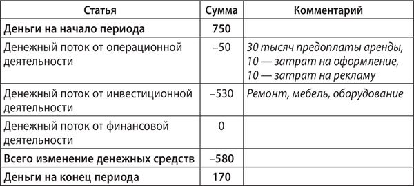 Операционная деятельность. Поступления от клиентов увеличились до 150 тысяч. Но запасы выросли с 30 до 60 тысяч. Это значит, что, помимо проданной продукции, на которую ушло 80 тысяч (по себестоимости), было дополнительно закуплено и оплачено 30 тысяч товара на склад. Кроме этого, выросла до 12 тысяч в месяц зарплата персонала за счёт расширения штата, до 3 тысяч коммунальные платежи, до 5 тысяч затраты на рекламу. Именно эти суммы расписаны в графе денежного потока от операционной деятельности.