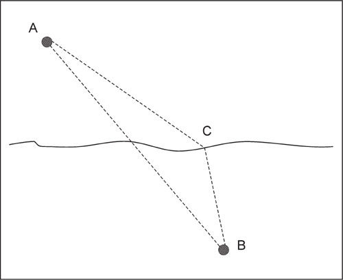Но ситуация такова, что скорость вашего передвижения в воде и по земле не одинакова. И это существенно влияет на оптимальное решение. Оптимальное решение оказывается вовсе не тем, чтобы двигаться по прямой. Если в воде вы передвигаетесь медленнее, то оптимум будет достигнут, если несколько сократить длину пути по воде и увеличить по земле. Общее большее расстояние будет пройдено быстрее, чем кратчайшее.