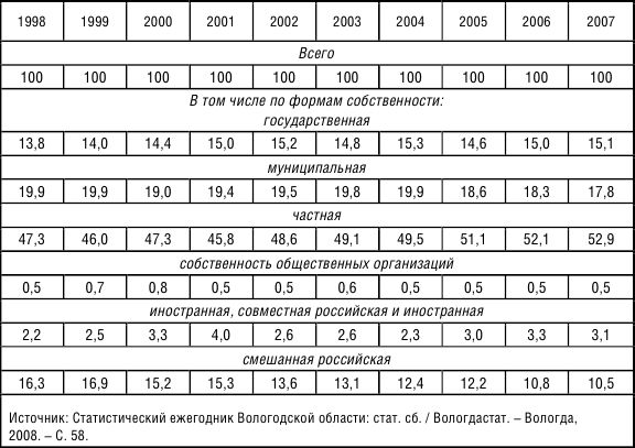 Продолжается рост занятости в частном секторе. Начиная с 2005 г. в нем трудится более половины занятых в экономике Вологодской области (табл. 2.12) . В целом за период с 1998 по 2007 г. доля занятых в частном секторе увеличилась с 47 до 53 %.