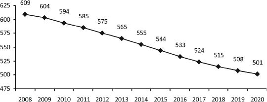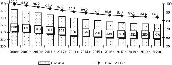 При сохранении существующих тенденций [33] численность занятых в экономике области к началу 2020 г. сократится на 18 % по сравнению с 2008 г. и составит 501 тыс. чел. (рис. 2.8) .