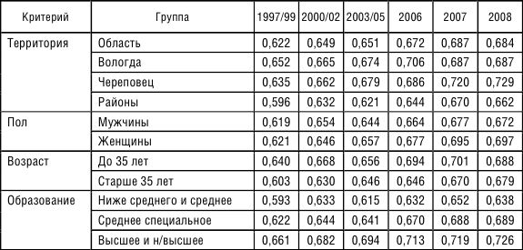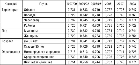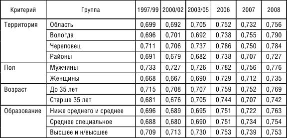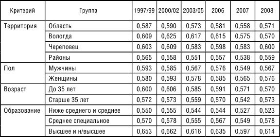 Тем не менее динамика индексов коммуникабельности различных социально-демографических групп населения характеризуется слабой тенденцией к росту. Следует отметить, что более высокой коммуникабельностью отличаются (табл. 3.6) :