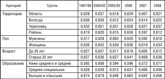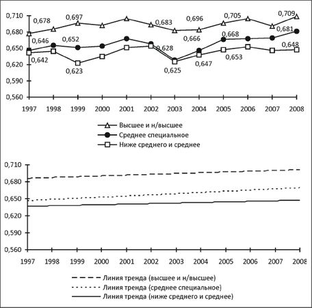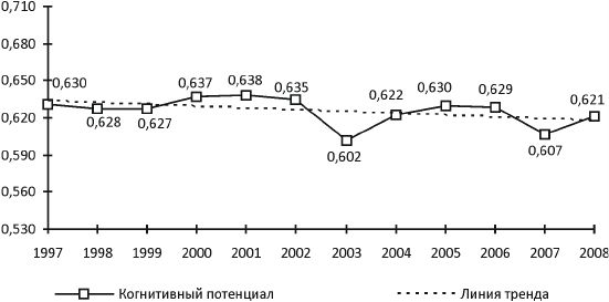 Когнитивный потенциал. Анализ социальной дееспособности населения Вологодской области в зависимости от уровня образования показал, что специалисты с высшим и незаконченным высшим профессиональным образованием имеют более высокие значения интегрального индекса качества трудового потенциала, во многом обусловленные высоким уровнем знаний, или высоким индексом когнитивного потенциала (рис. 3.8) . Индекс когнитивного потенциала входит в группу самых низких среди восьми базовых индексов. В период с 1997 по 2008 г. наибольшее его значение составило 0,638 ед. (в 2001 г.), наименьшее – 0,602 ед. (в 2003 г.; рис. 3.9 ). При этом в течение семи из 11 лет наблюдений значения данного индекса были ниже, чем в начале мониторинга. В долгосрочной перспективе когнитивный потенциал имеет тенденцию к снижению.