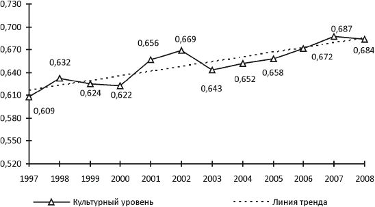 Культурный уровень. Как видно из данных рисунка 3.12 , индекс культурного уровня имеет самую выраженную тенденцию роста по сравнению с остальными базовыми индексами. Он повысился с 0,609 ед. в 1997 г. (минимальное принятое значение) до 0,684 ед. в 2008 г. Максимальное значение показателя зафиксировано в 2007 г. – 0,687 ед.