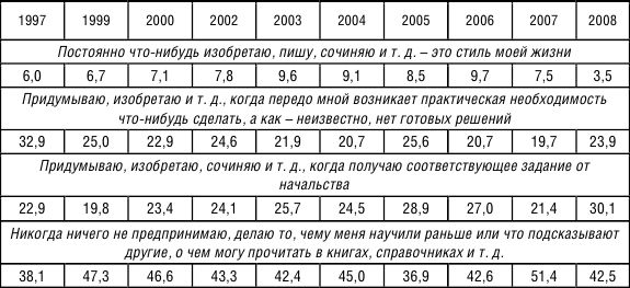 Таблица 3.5. Динамика распределения ответов на вопрос: "В какой мере для Вас в настоящее время характерно занятие творческой (рационализаторской, изобретательской) деятельностью?" , в %
