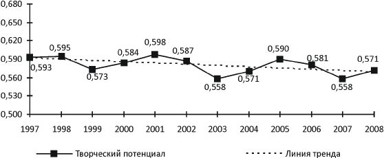 Творческие способности. Индекс творческих способностей является одним из самых низких среди базовых индексов. Его максимальное за весь период исследований значение составило 0,598 ед. (в 2001 г.), минимальное – 0,558 ед. (в 2003 и 2007 гг.; рис. 3.10 ).