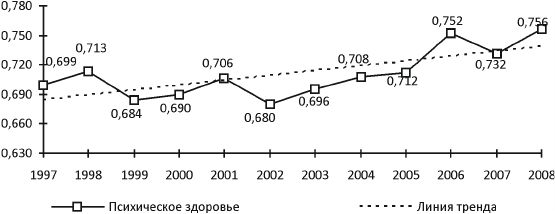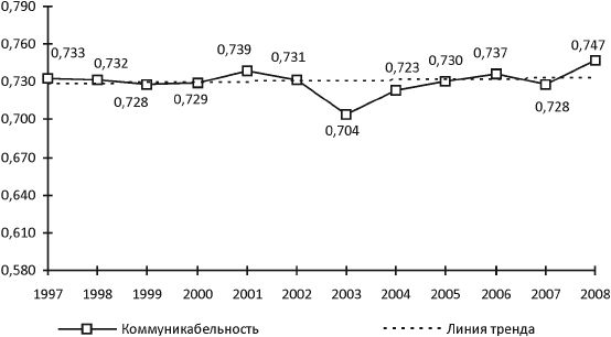 Коммуникабельность. Индекс коммуникабельности входит в группу самых высоких среди восьми базовых индексов. Его поведение отличается сравнительно плавными изменениями – почти без колебаний (рис. 3.11) . В период с 1997 по 2008 г. наибольшее значение индекса составило 0,747 ед. (в 2008 г.), наименьшее – 0,704 ед. (в 2003 г.). Линия тренда параллельна оси времени, что говорит о тенденции к постоянству в долгосрочной перспективе.