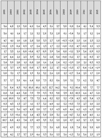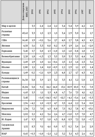 Таблица 1. Темпы прироста ВВП в ведущих развитых и развивающихся странах по годам, 1990–2013 годы (в %)