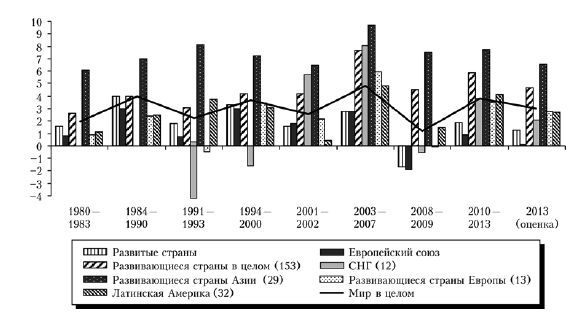 Несмотря на замедление развития мировой экономики в 2012–2013 гг., средние темпы роста в этот период хотя и ниже, чем в 2000-е гг., но соответствуют среднегодовым темпам роста мирового ВВП в 1990-е гг. (рис. 2). Поэтому говорить о долгосрочной стагнации пока преждевременно.