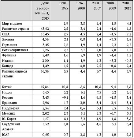 Развивающиеся страны пока остаются наиболее динамичной группой, хотя их темпы роста заметно замедлились в 2012–2013 гг. Причем лидерство здесь по-прежнему поддерживается за счет азиатских стран. Однако доля развивающихся стран в мировом ВВП повышается благодаря как высоким темпам роста в развивающихся странах Азии, так и расширению группы динамично растущих развивающихся стран, в частности за счет стран Латинской Америки.