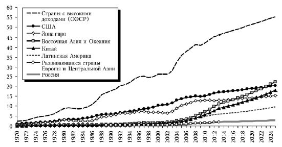 Второе измерение дискуссии о долгосрочной стагнации касается вопроса о том, справедливо это только для развитых стран либо затрагивает все страны. При описании факторов замедления темпов экономического роста мы практически везде упоминали группу развитых стран. Однако такое замедление в них неизбежно влияет на темпы роста и развивающихся стран. Основными каналами этого выступают аутсорсинг производства, наличие основного объема конечного спроса в развитых странах, необходимость трансфера технологий и капитала из развитых в развивающиеся страны, глобализация мирового финансового рынка, способного перенаправлять в условиях глобального спада экономической активности капиталы из развивающихся стран в безрисковые активы (то есть активы в развитых странах).