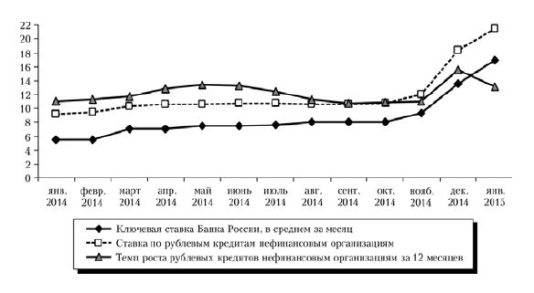Рис. 7. Процентные ставки и темп роста рублевых кредитов нефинансовым организациям (в %)