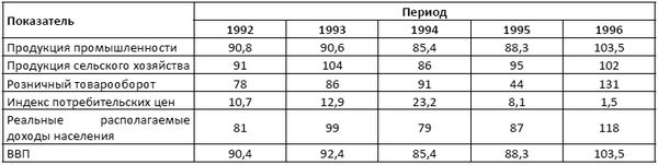 Динамика основных социально-экономических показателей Белоруссии в 1992–1996 гг. (в% к предыдущему году)