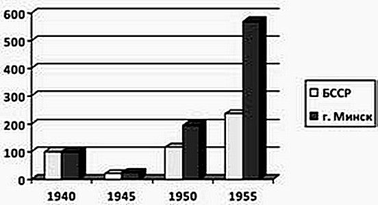 Благодаря трудовому героизму народа, союзным капиталовложениям, а также братской помощи народов СССР и помощи ООН-ЮНРРА, в 1950 г. Белоруссия не только достигла довоенного уровня выпуска промышленной продукции, но и превзошла его на 15 % (рис. 1).