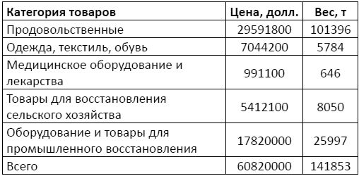 Около половины помощи ООН по стоимости и 71 % по весу составляли продукты питания. Поступали мясо, молочные продукты, жиры, растительное масло, зерно, бобы, рыба и рыбопродукты, соки, джемы. Значительная часть продуктов направлялась в детские дома, больницы, раздавалась наиболее потерпевшим гражданам. Почти на 18 млн. долл, было поставлено оборудования и товаров для восстановления промышленности: электростанции из Англии, американские грузовики, трактора и бульдозеры, французские и английские строительные краны и т. д. Помощь в восстановлении сельского хозяйства включала 653 колесных и 130 гусеничных тракторов, 5300 т семенного зерна, семена овощей, клевера, вики, других травяных культур. Были получены одежда и обувь, медицинское оборудование и лекарства. Все это, несмотря на ограниченный, недостаточный объем, сыграло важную роль в удовлетворении первоочередных потребностей населения и преодолении послевоенной разрухи в БССР.