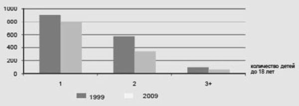 Рис. 5.Домохозяйства, состоящие из двух и более человек (тыс., по количеству детей в возрасте от 18 лет в 1999 и 2009 гг.)