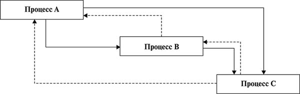 Можно выделить прямые и обратные связи между процессами, а также связи непосредственные и опосредованные (рис. 5.5). Например, информация процесса А передается процессу B, который не может работать без этой информации, – связь прямая. В то же время результаты процесса B могут учитываться в процессе А – связь обратная. Между процессами А и B нет других процессов – связь непосредственная. Те же связи между процессами B и С. Связь между процессами А и С осуществляется через процесс B – она опосредованная. Очевидно, что сбой в одном процессе ведет к сбою в других процессах.