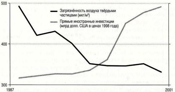 Ещё одно свидетельство экологического эффекта иностранных инвестиций в бедных странах - замеры загрязнений в Китае, Бразилии и Мексике. 60% иностранных инвестиций в бедные страны поступает в эти три государства. Из графика 9.1 видно, как с развитием китайской экономики уменьшалось загрязнение воздуха в городах. В то же самое время иностранные компании, пользуясь дешевизной рабочей силы, строили в стране фабрики по производству товаров либо для внутреннего рынка, либо на экспорт, так что объём иностранных инвестиций рос как на дрожжах. В Бразилии и Мексике наблюдается похожая картина.