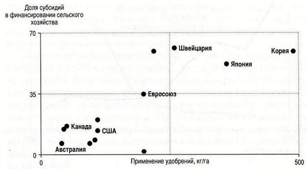 Другие богатые нации, особенно Япония и Корея, балуют своих фермеров не хуже Евросоюза: треть дохода средней фермы в странах ОЭСР составляет правительственная помощь, и как видно из графика 9.2, чем больше субсидий сельское хозяйство получает, тем больше удобрений оно потребляет. Если отменить Единую сельскохозяйственную политику и прочие протекционистские меры, экологическая обстановка, несомненно, улучшится вследствие менее интенсивного земледелия. При этом и европейские потребители, и фермеры третьего мира выиграют гораздо больше.