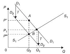 Второй вариант. Акцизный налог вносят в госбюджет покупатели. Покупатели будут согласны купить тот же объем блага, если его цена без налога будет на Т руб. ниже. В таком случае покупатели заплатят цену с включением налога, равную прежней цене. В результате линия спроса переместится вниз на Т (рис. 44.2). Новый объем продаж Q 2 , цены Р+ и Р- будут аналогичными варианту, при котором налог вносят продавцы. Следовательно, неважно, кто выступает непосредственным плательщиком налога – продавцы или покупатели.